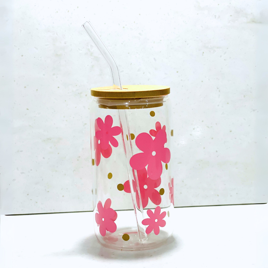 Pink Flowers Glass Cup