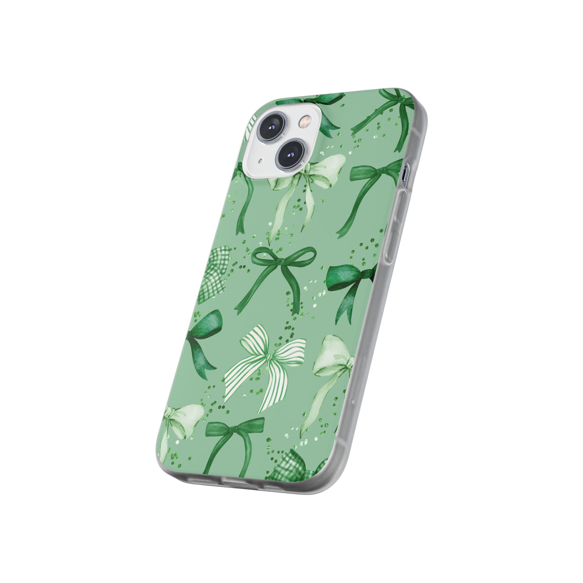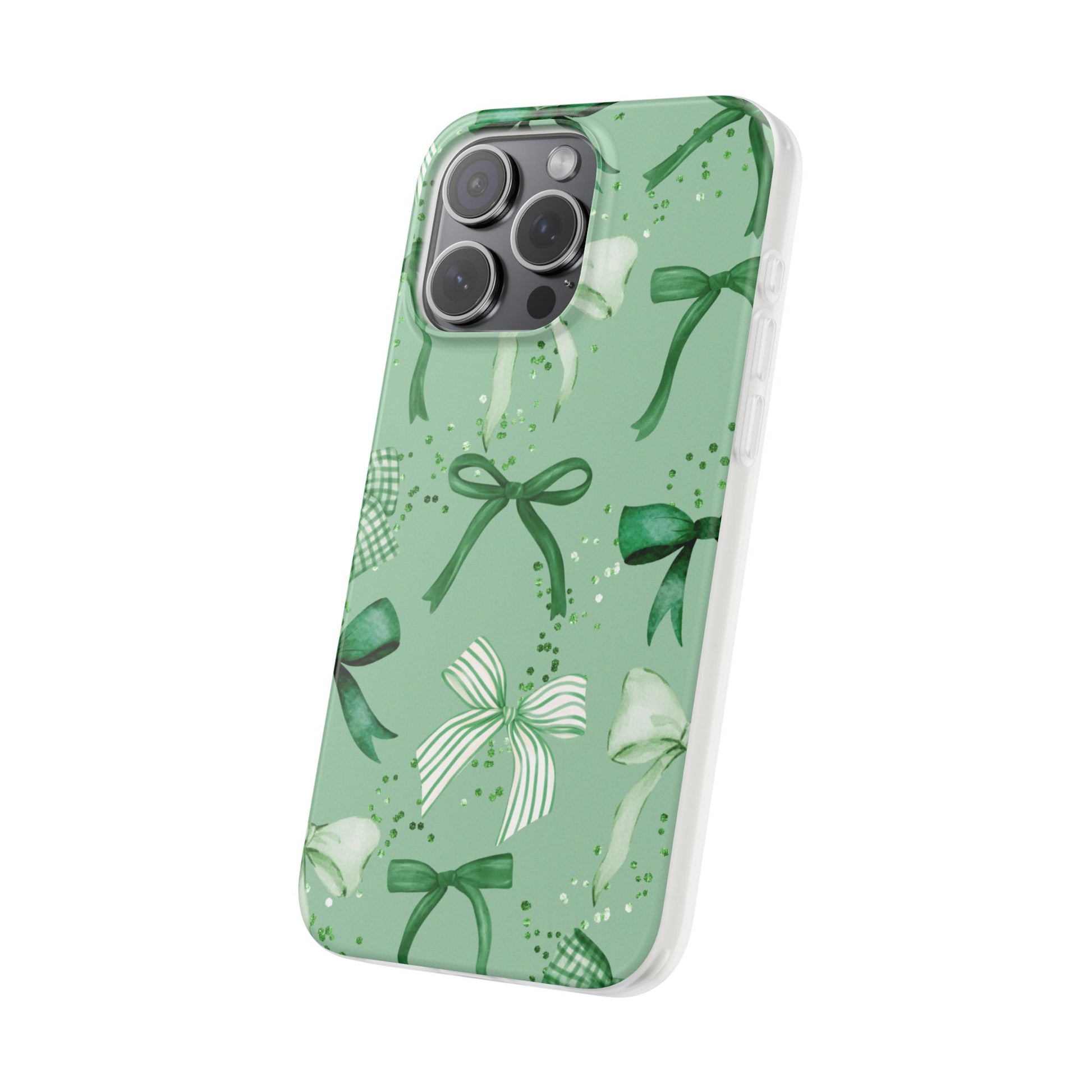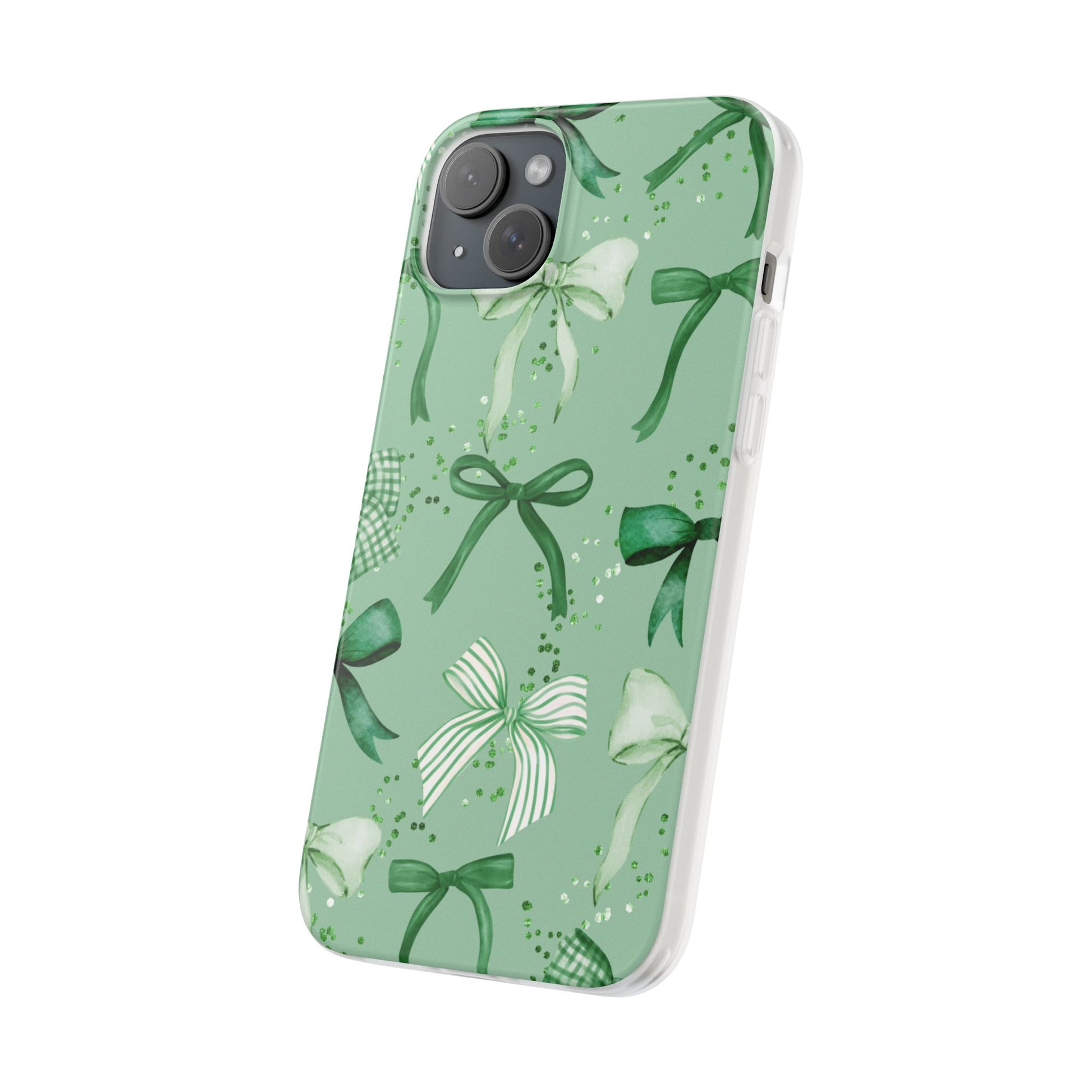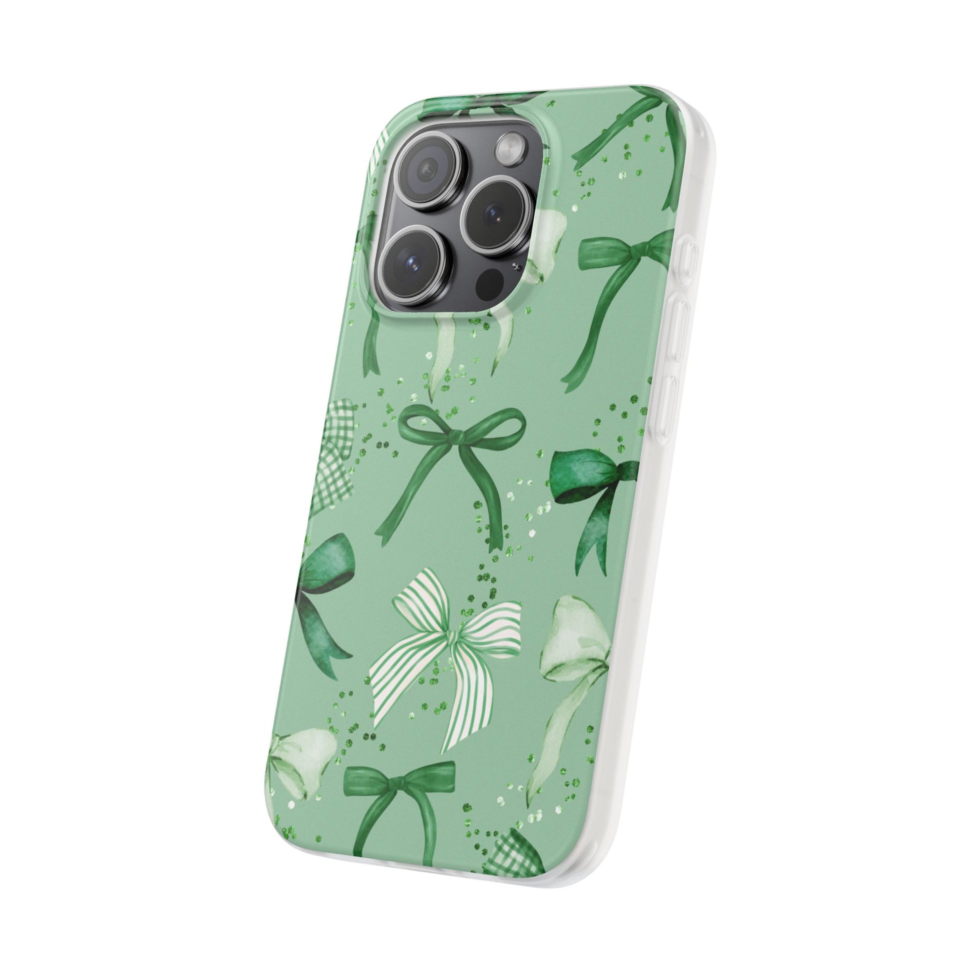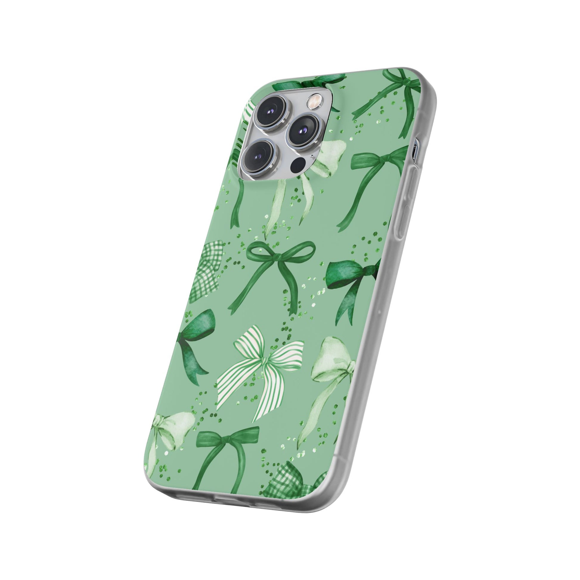 A minty green background with emerald green bows flexi case, offering a smooth frosted finish and flexibility with impact-absorbing design. Perfect for adding a pop of color and protection to your phone. Ideal for adults looking for a stylish and durable phone case, relevant to birthdays, holidays, and everyday use.