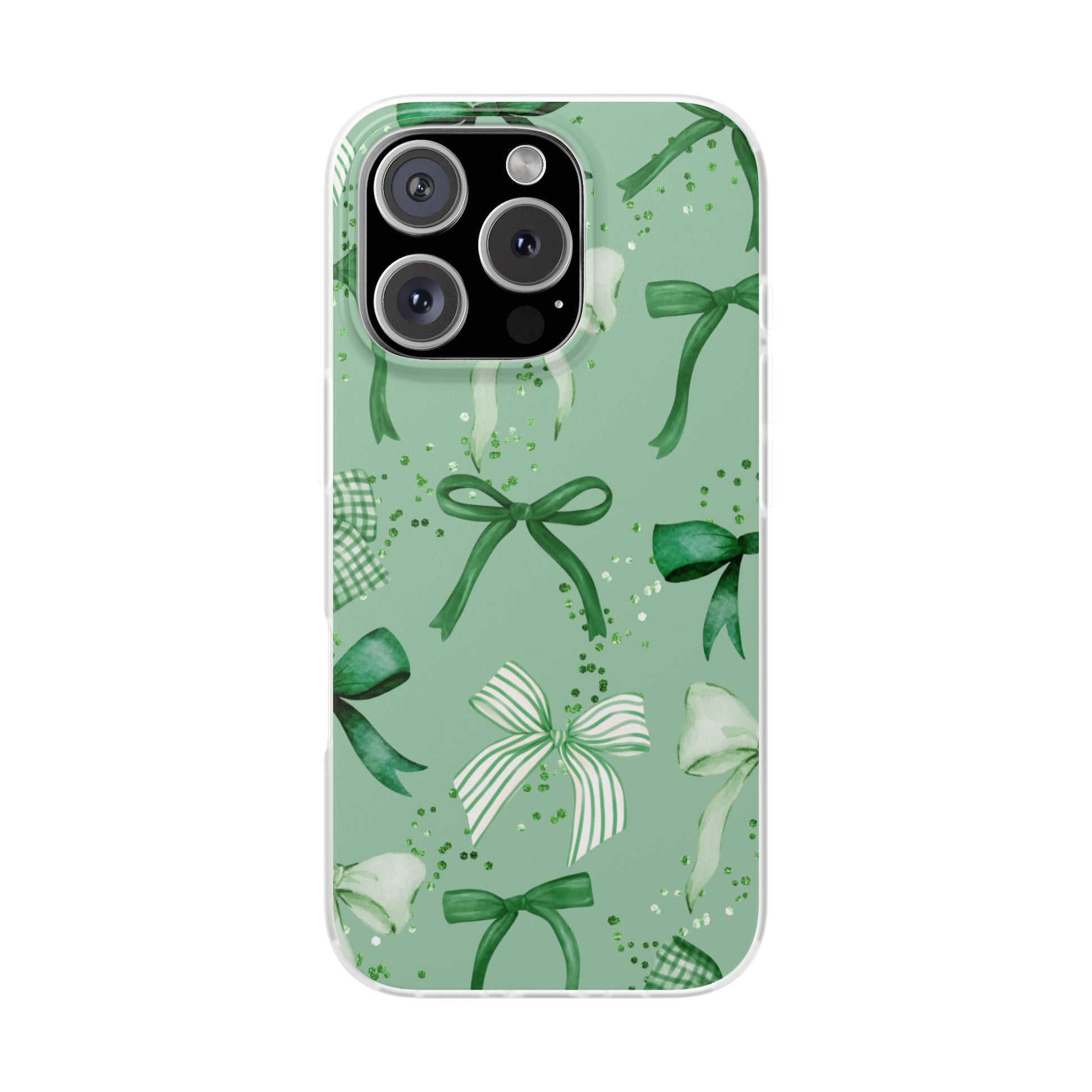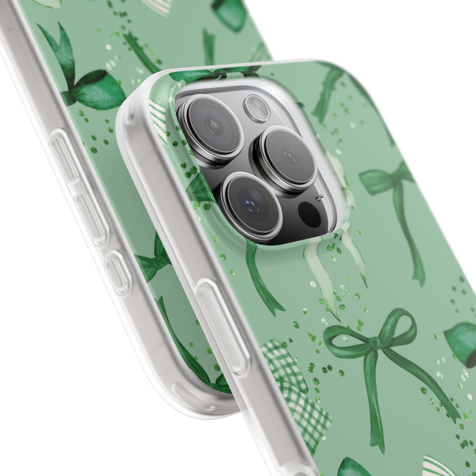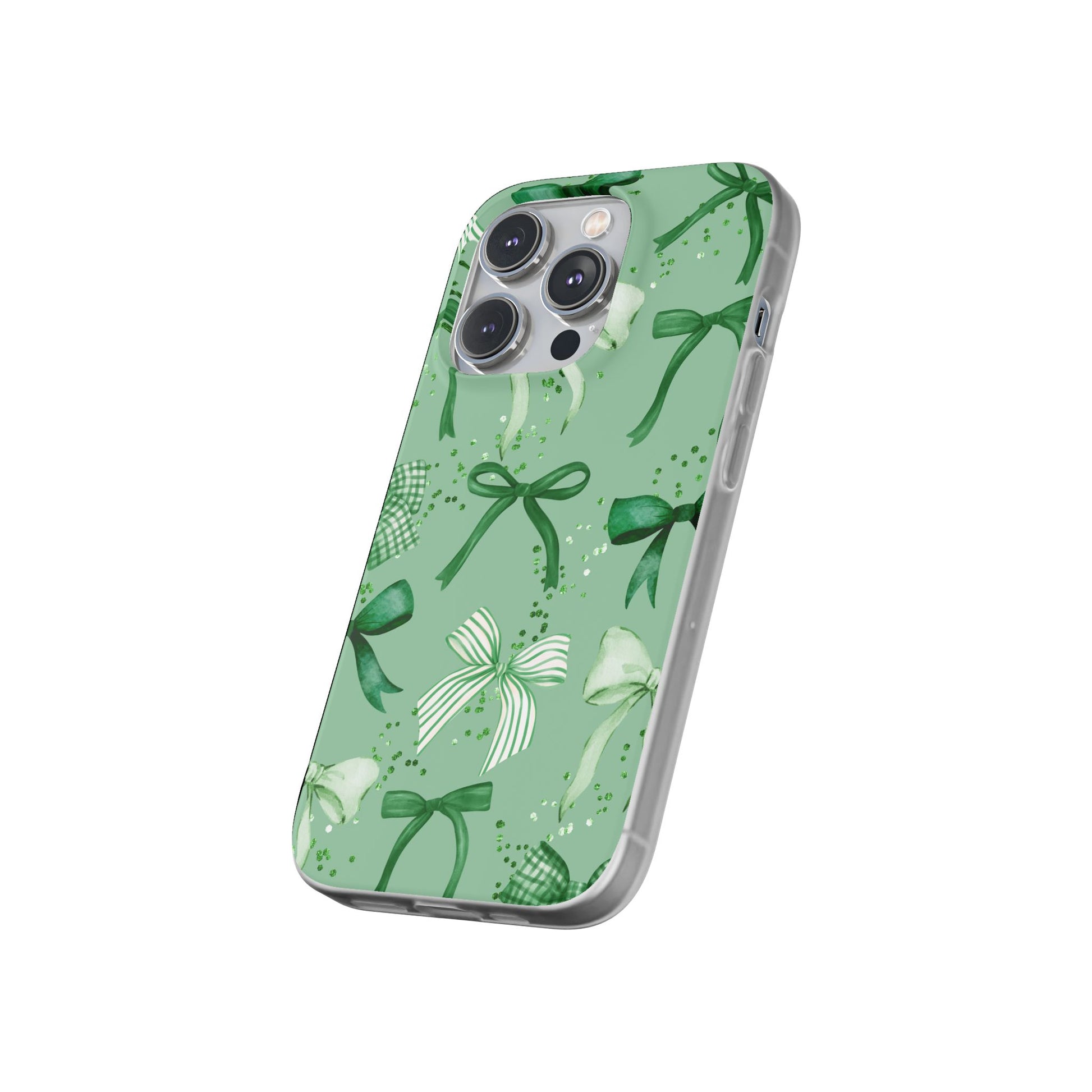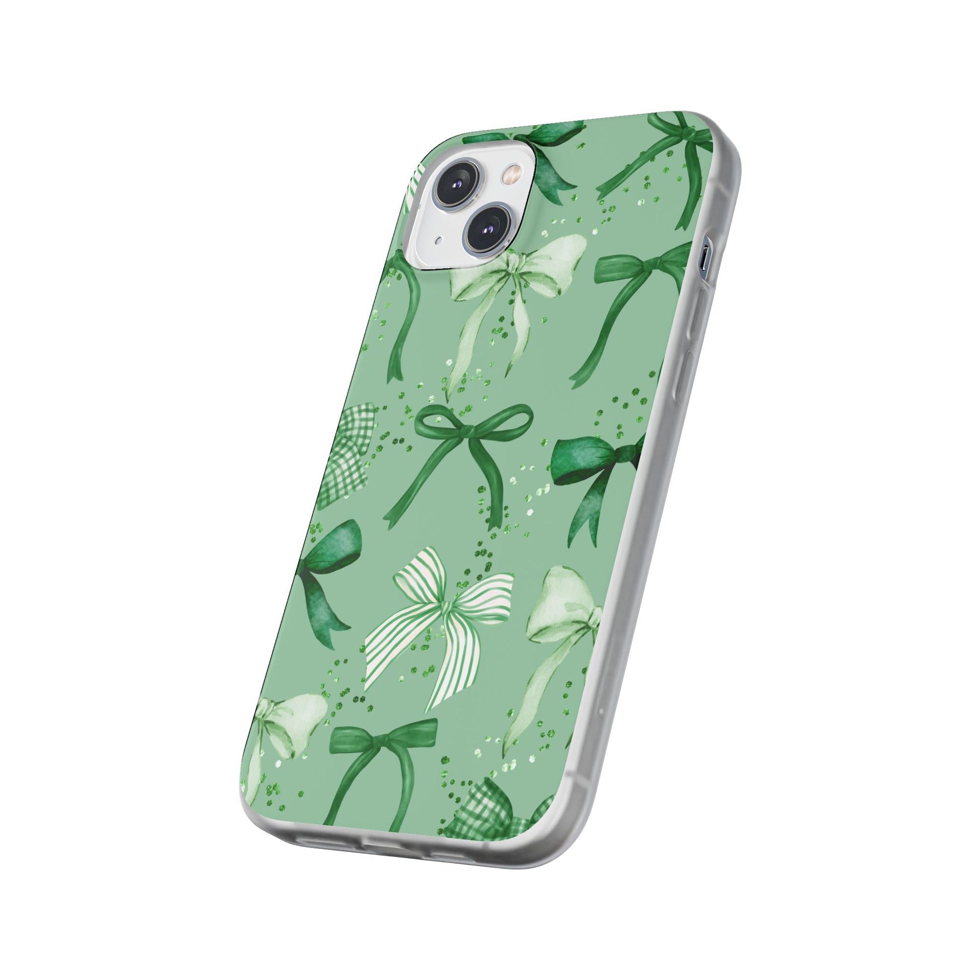 A minty green background with emerald green bows flexi case, offering a smooth frosted finish and flexibility with impact-absorbing design. Perfect for adding a pop of color and protection to your phone. Ideal for adults looking for a stylish and durable phone case, relevant to birthdays, holidays, and everyday use.