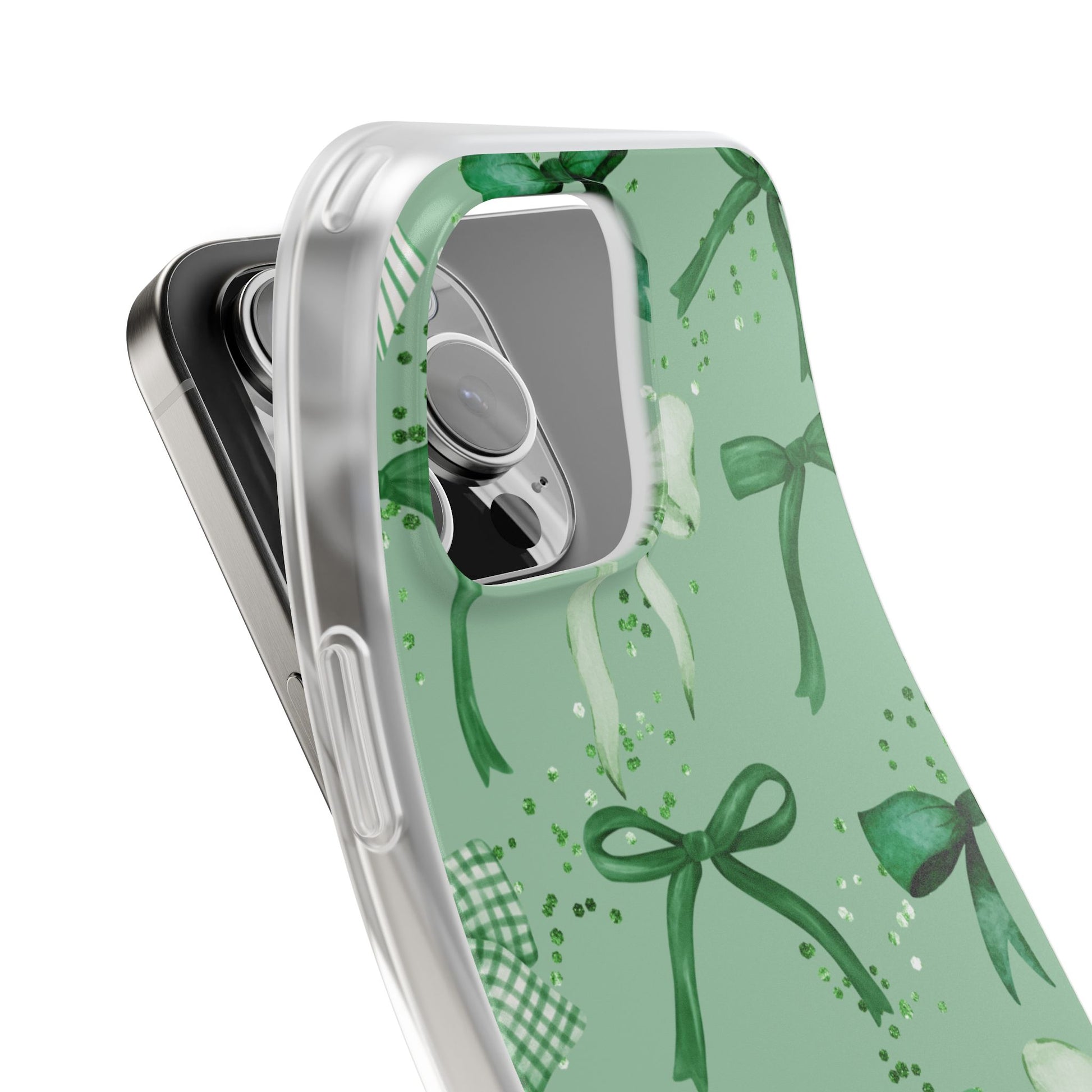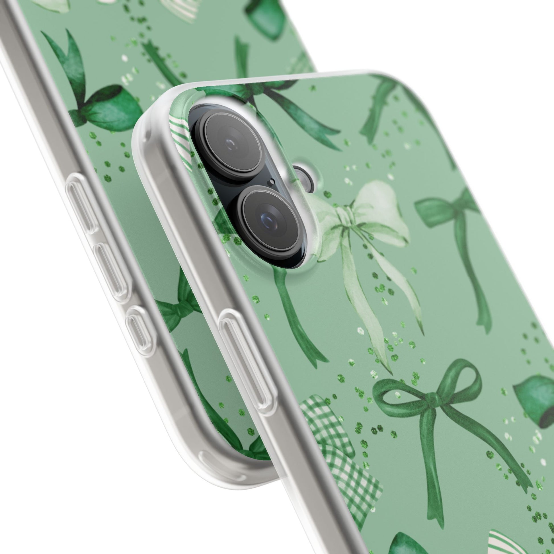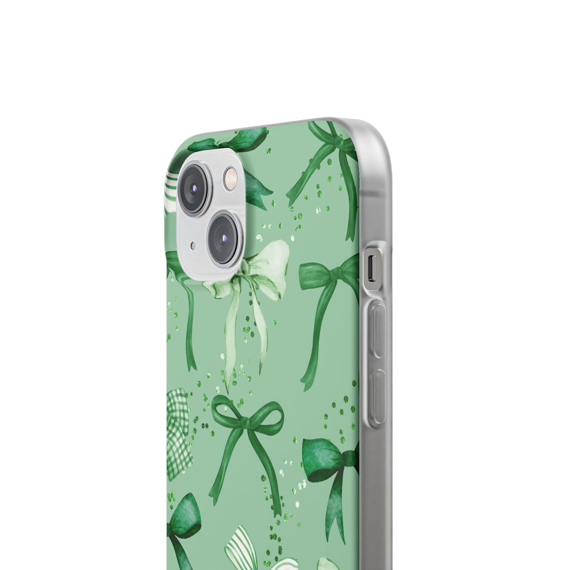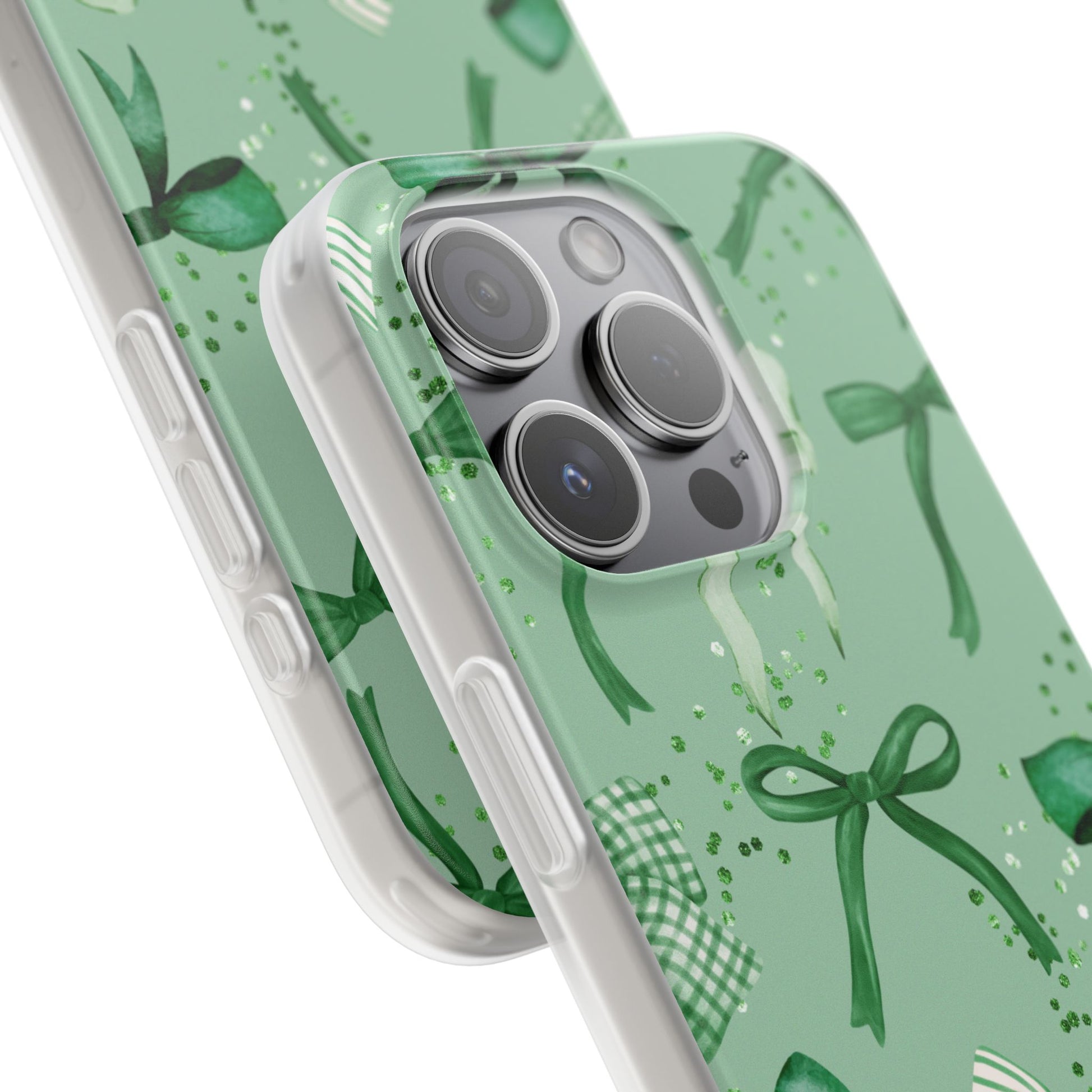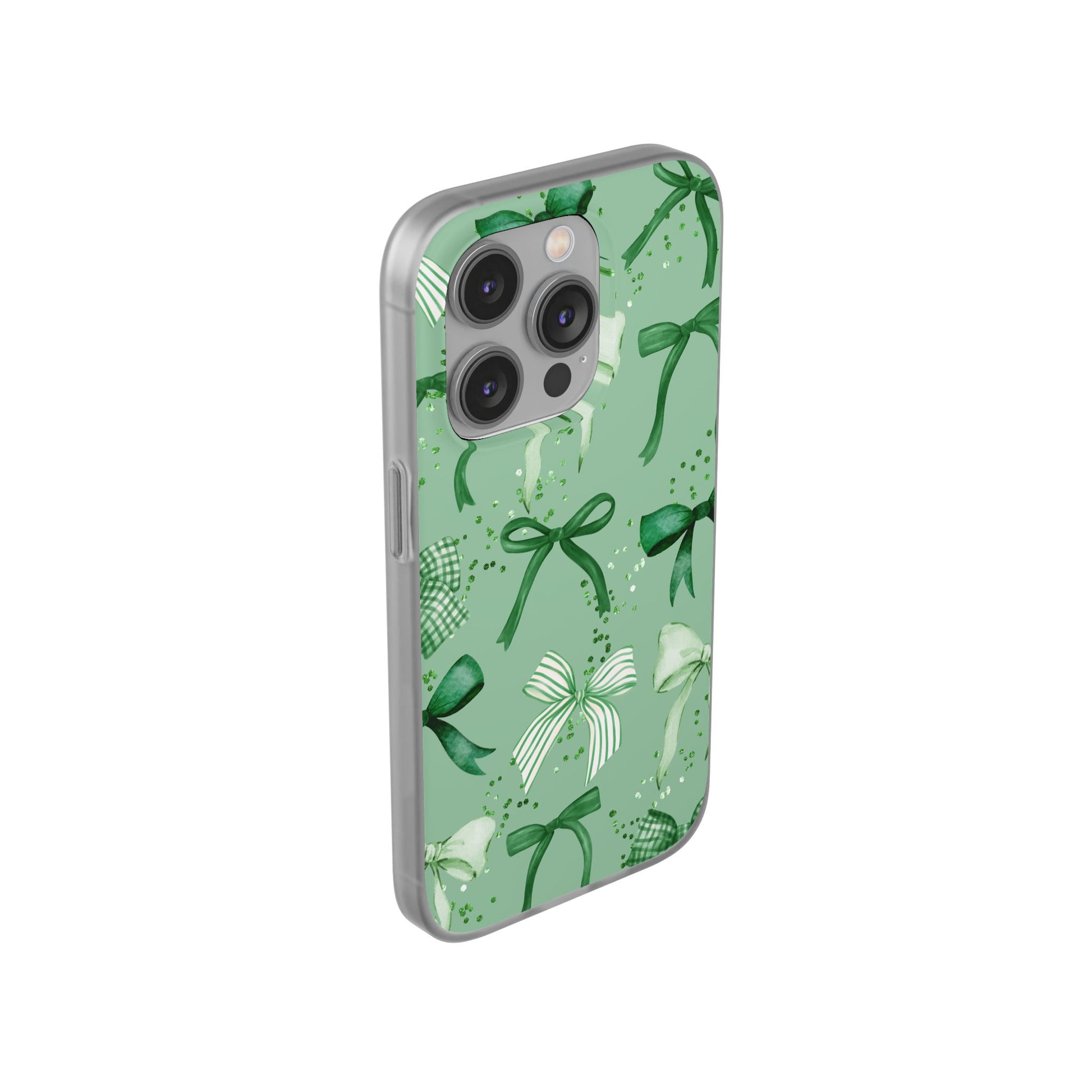 A minty green background with emerald green bows flexi case, offering a smooth frosted finish and flexibility with impact-absorbing design. Perfect for adding a pop of color and protection to your phone. Ideal for adults looking for a stylish and durable phone case, relevant to birthdays, holidays, and everyday use.