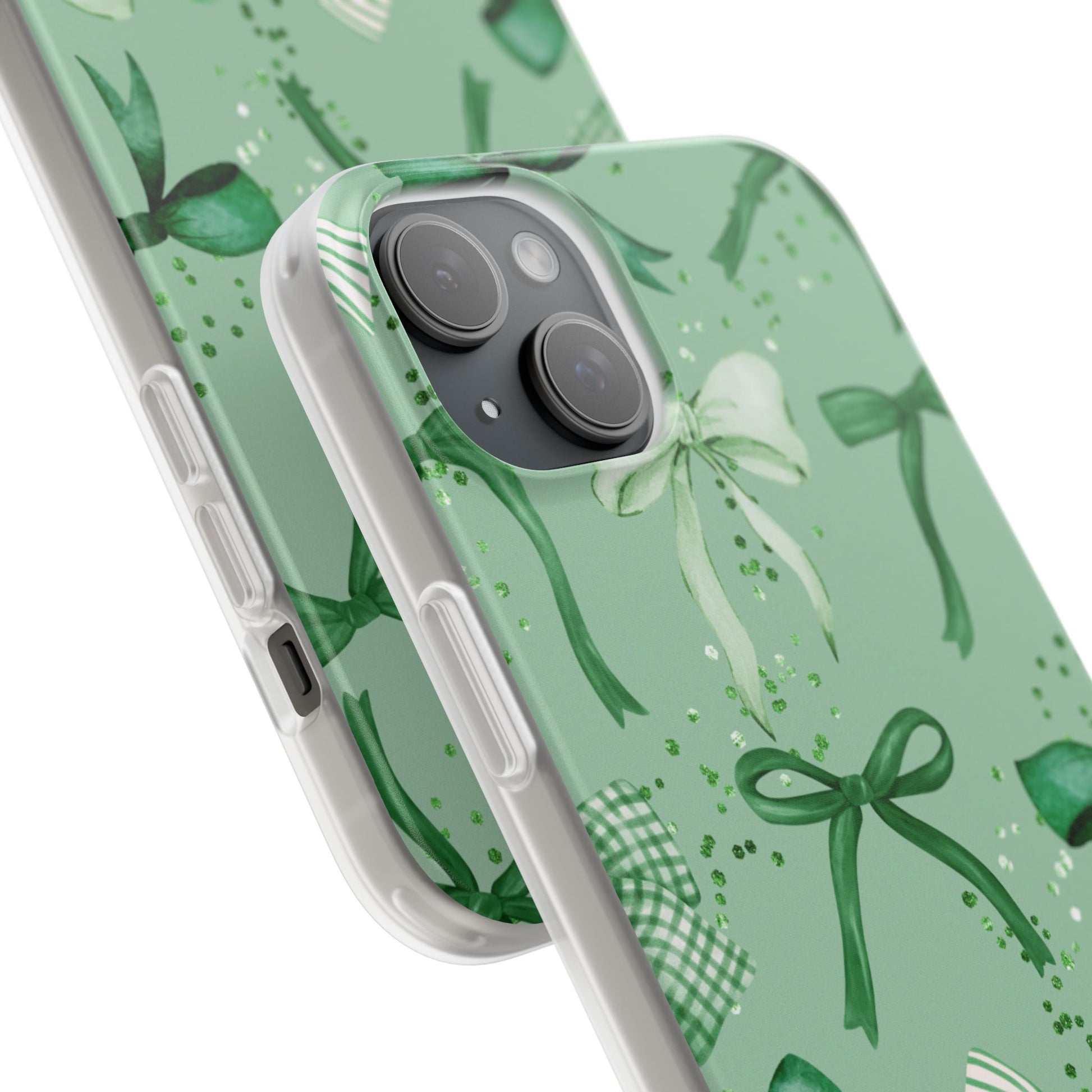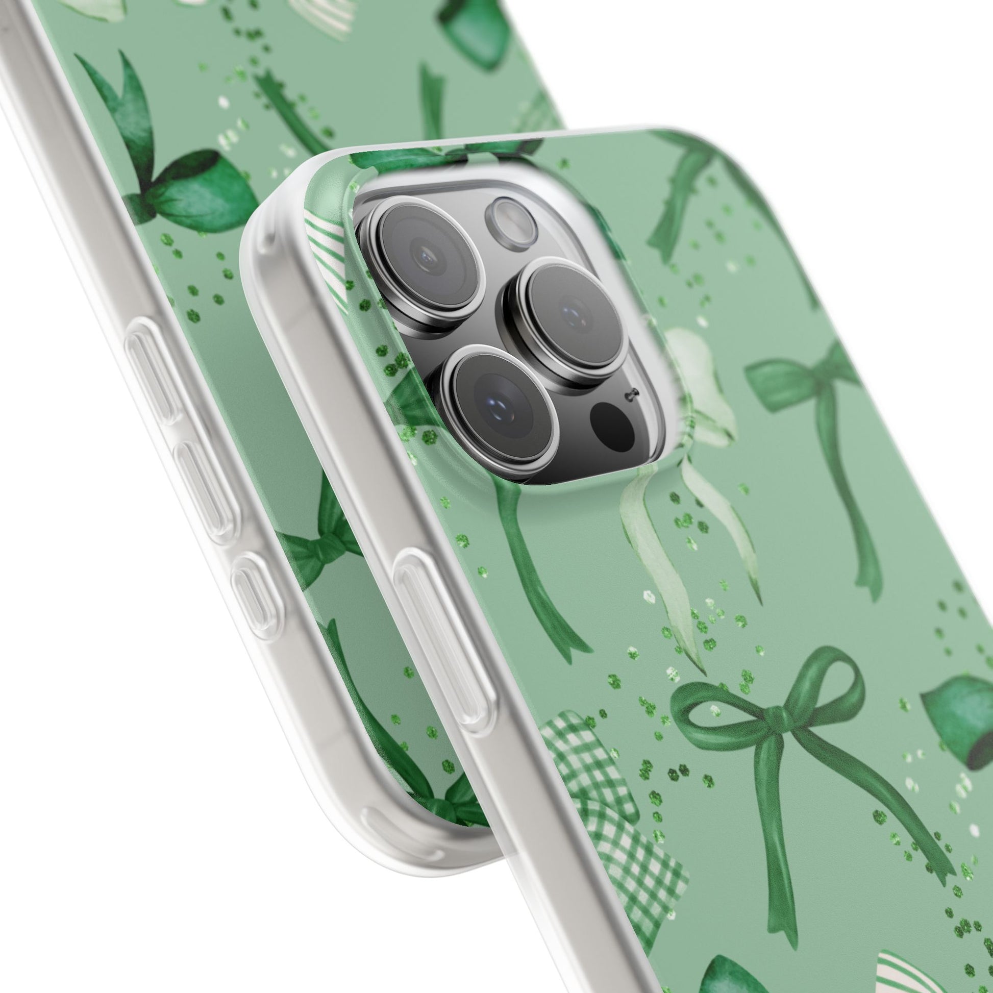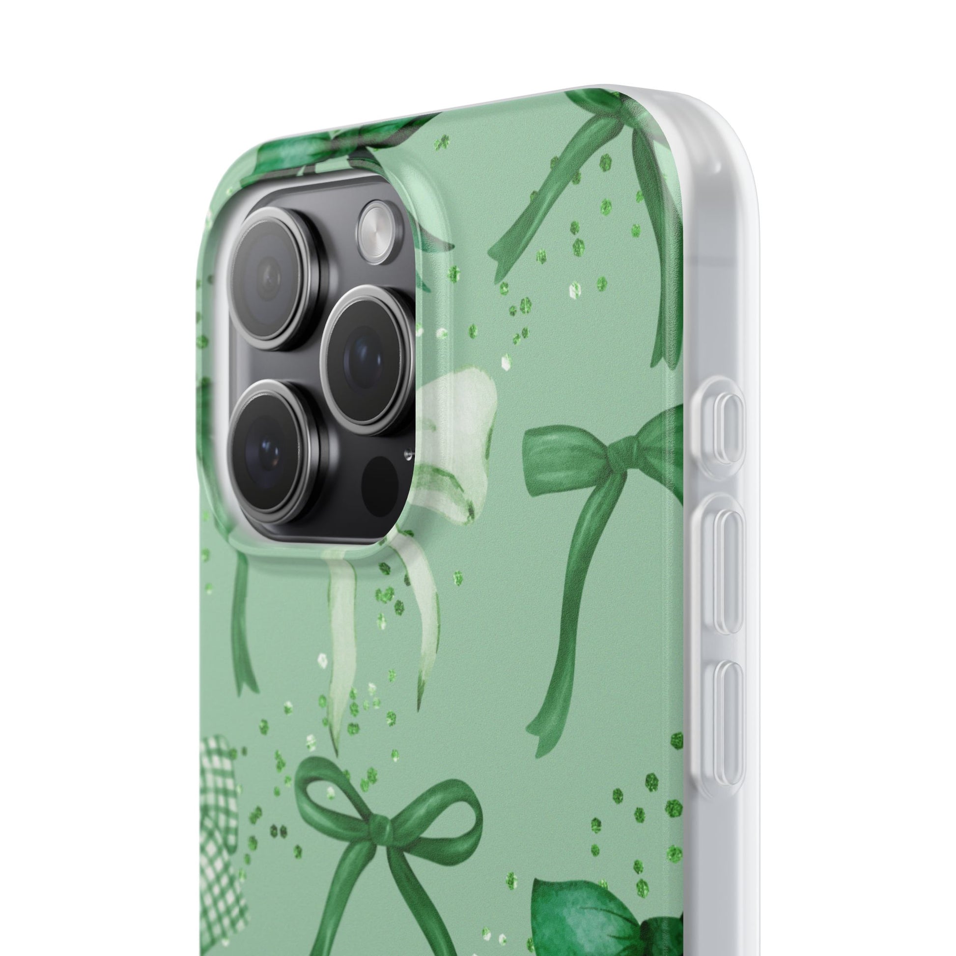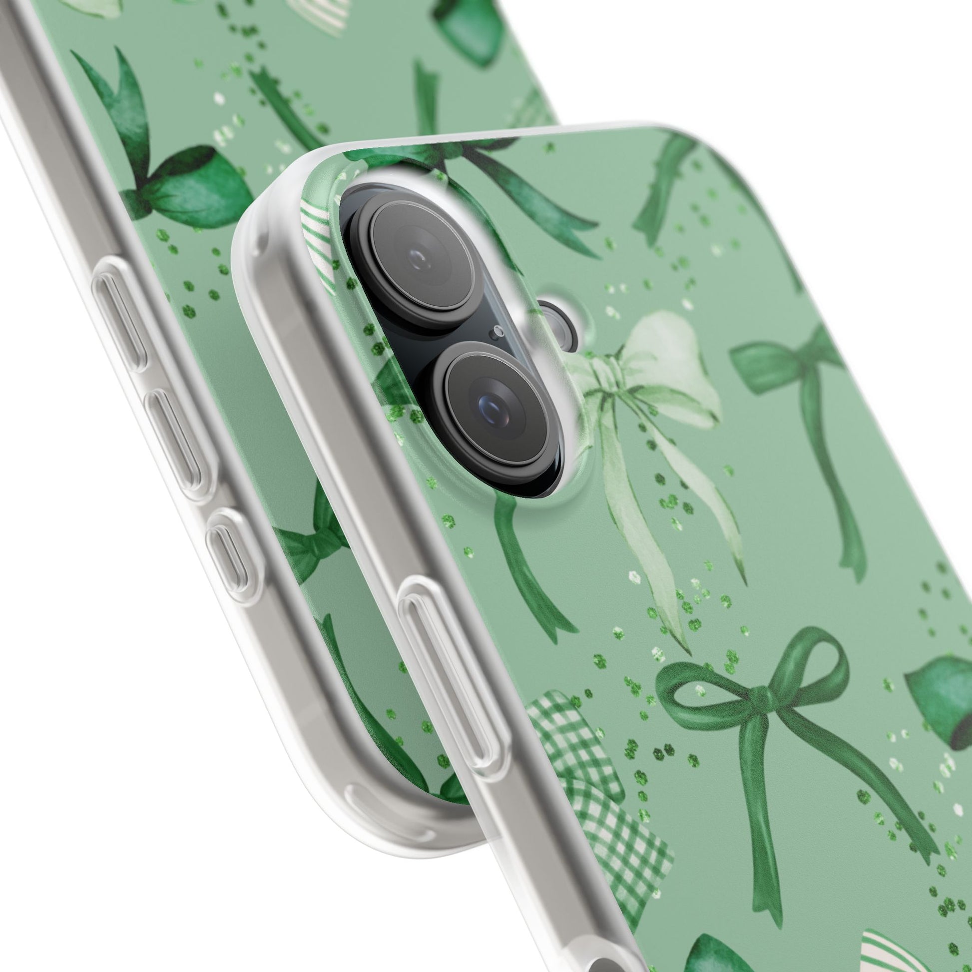 A minty green background with emerald green bows flexi case, offering a smooth frosted finish and flexibility with impact-absorbing design. Perfect for adding a pop of color and protection to your phone. Ideal for adults looking for a stylish and durable phone case, relevant to birthdays, holidays, and everyday use.