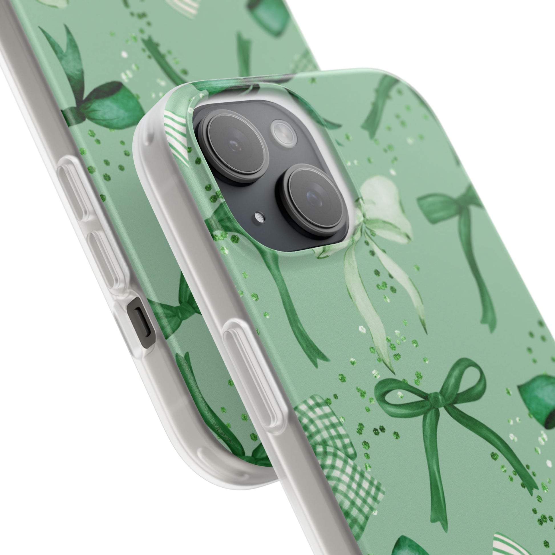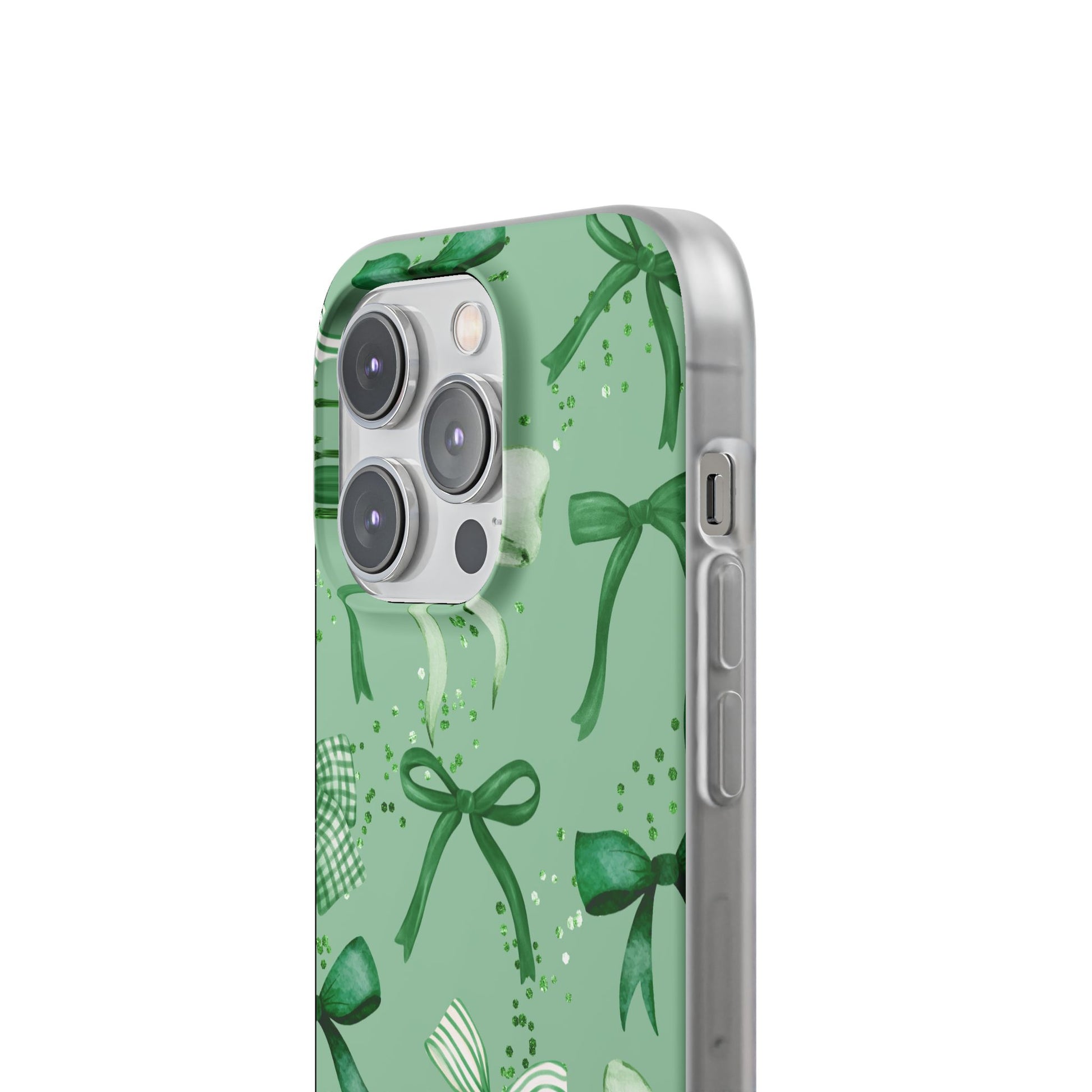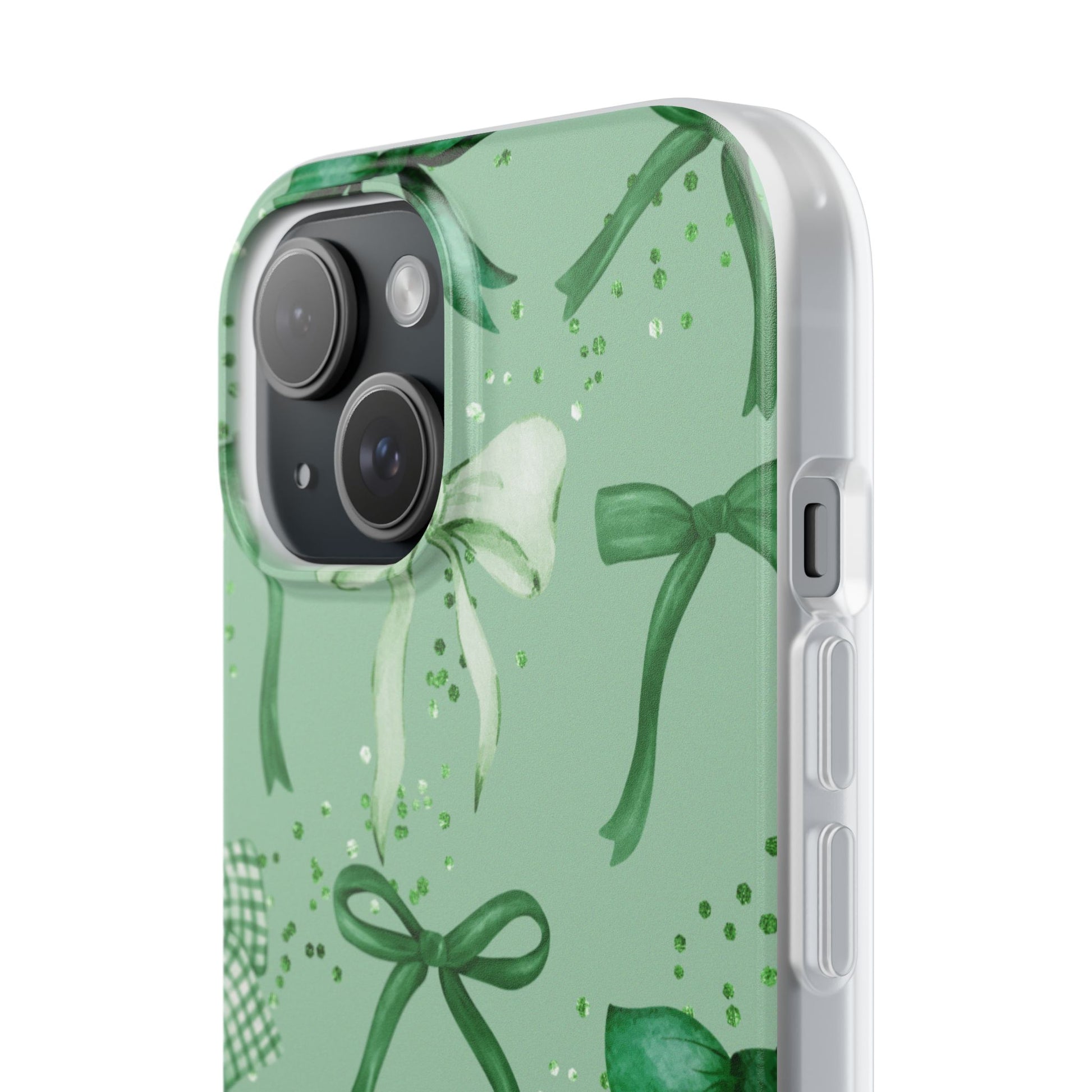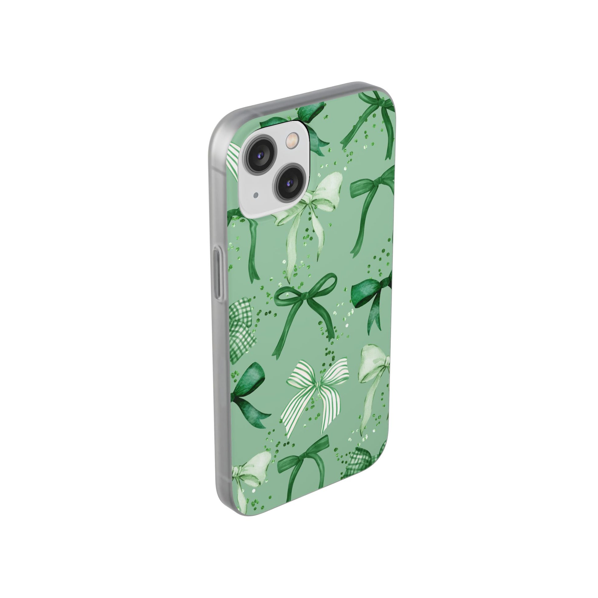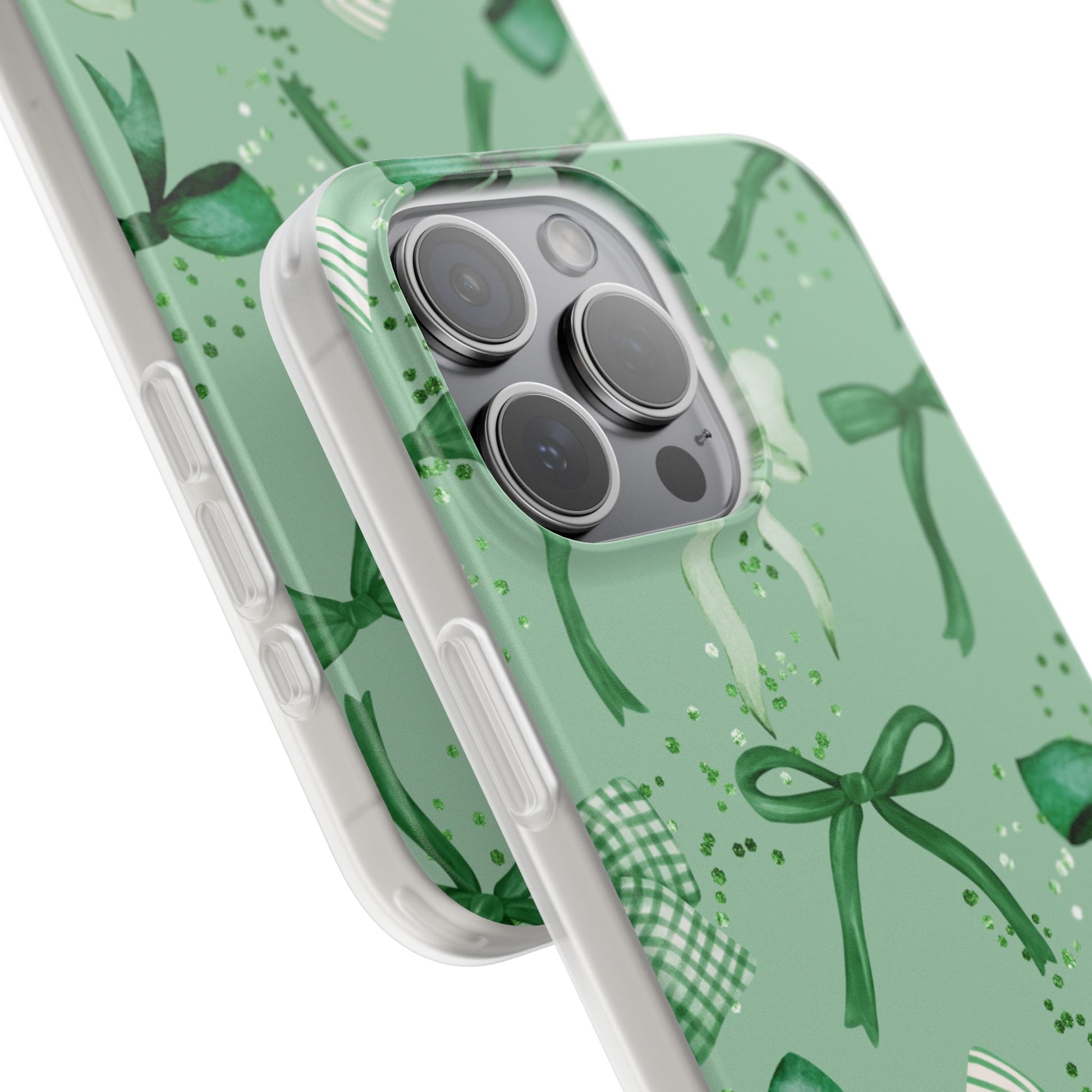 A minty green background with emerald green bows flexi case, offering a smooth frosted finish and flexibility with impact-absorbing design. Perfect for adding a pop of color and protection to your phone. Ideal for adults looking for a stylish and durable phone case, relevant to birthdays, holidays, and everyday use.