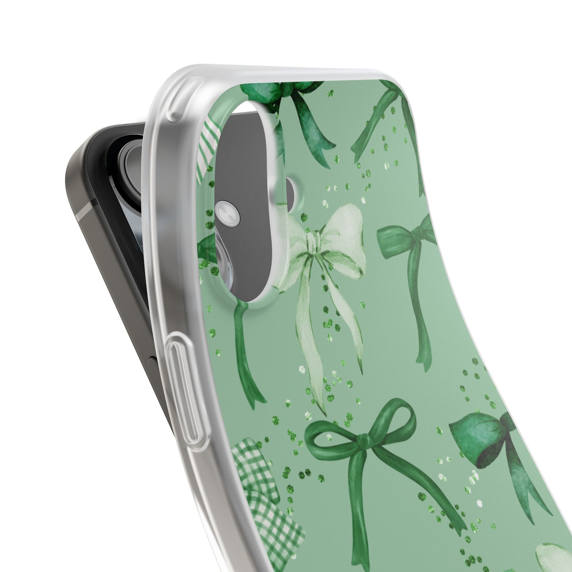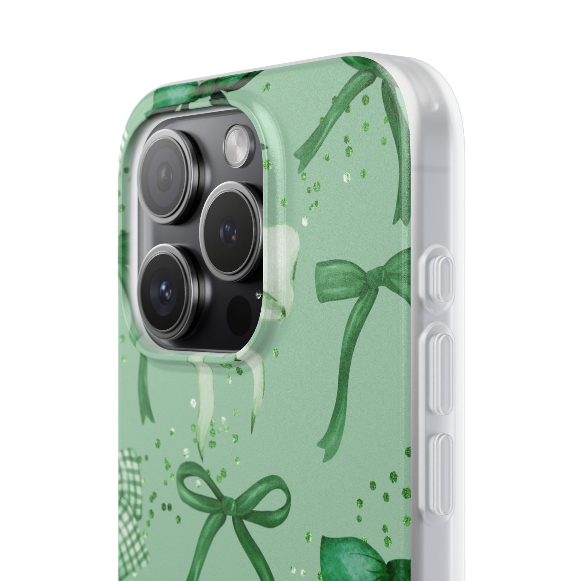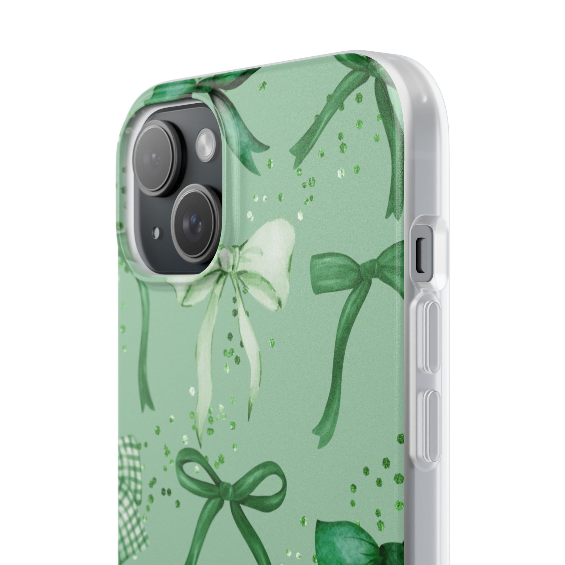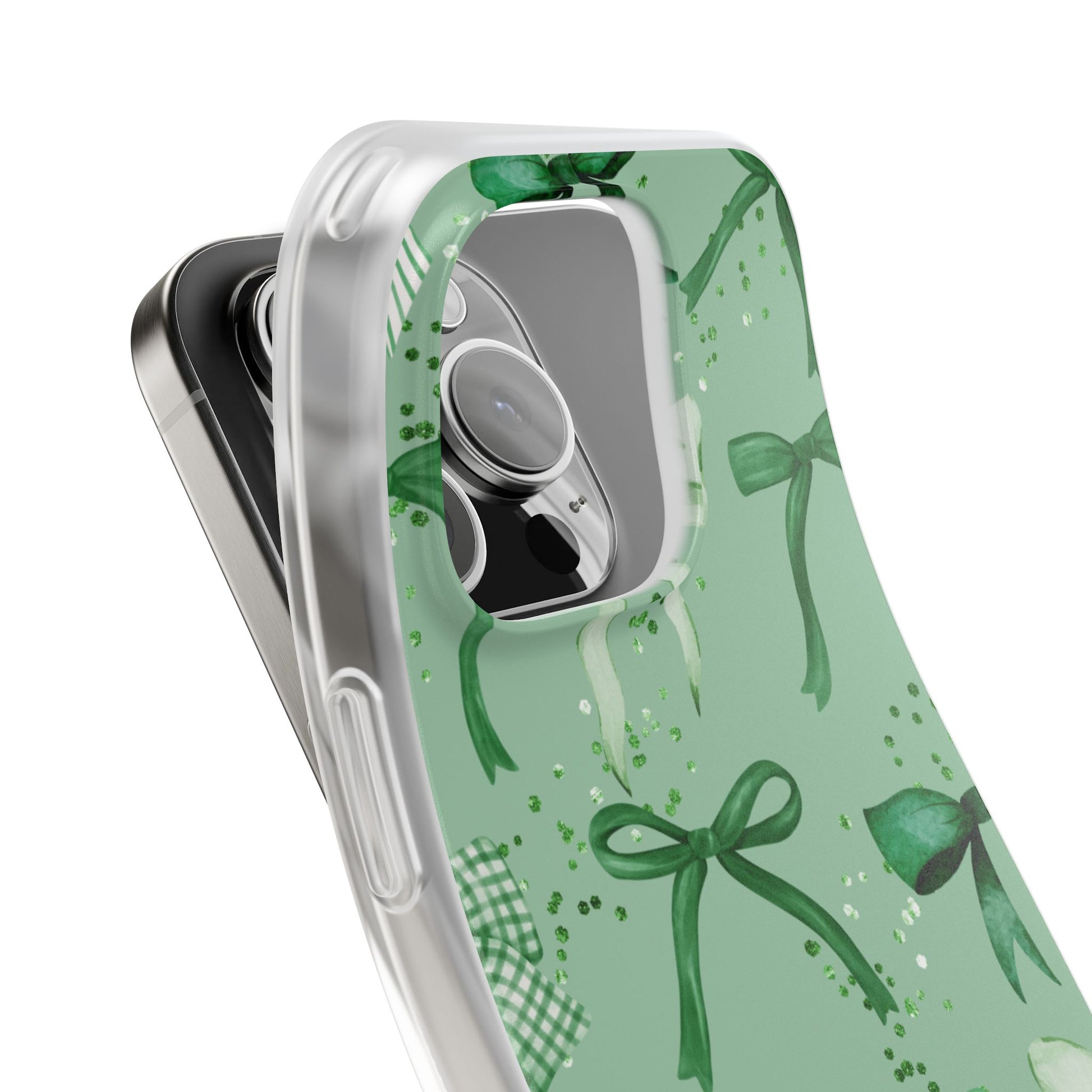 A minty green background with emerald green bows flexi case, offering a smooth frosted finish and flexibility with impact-absorbing design. Perfect for adding a pop of color and protection to your phone. Ideal for adults looking for a stylish and durable phone case, relevant to birthdays, holidays, and everyday use.