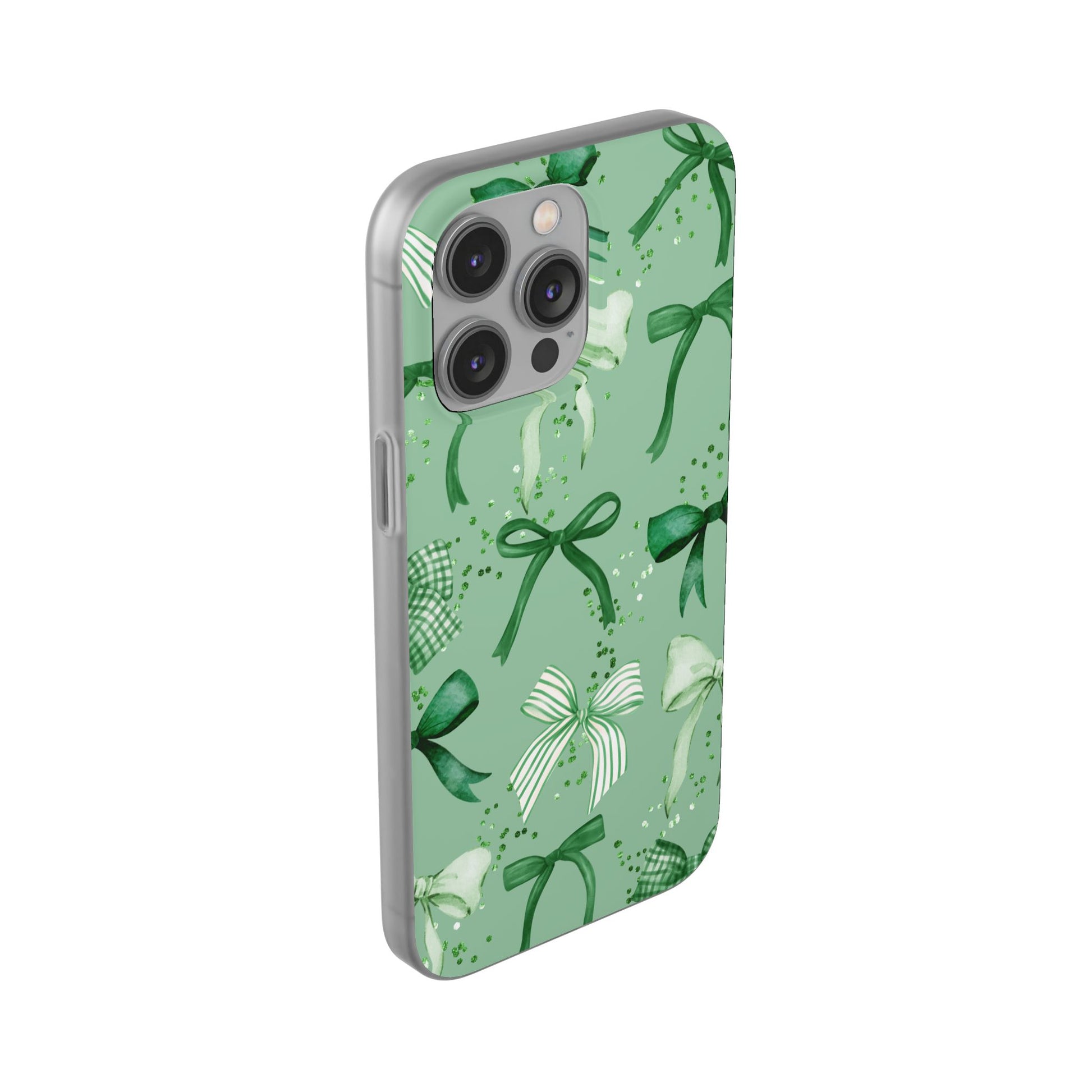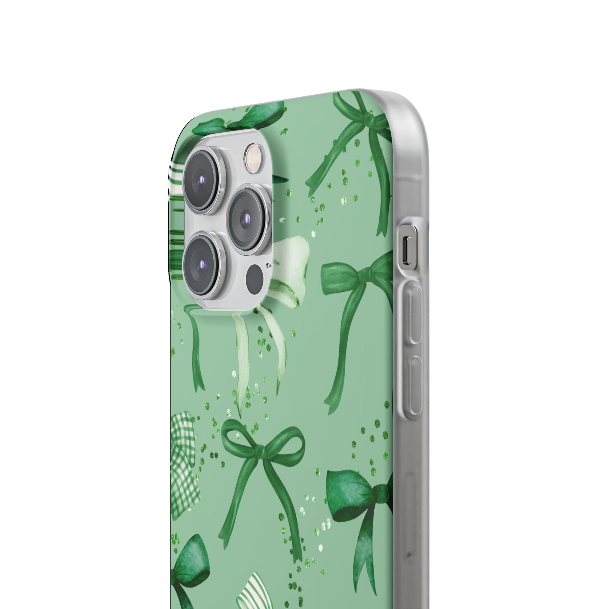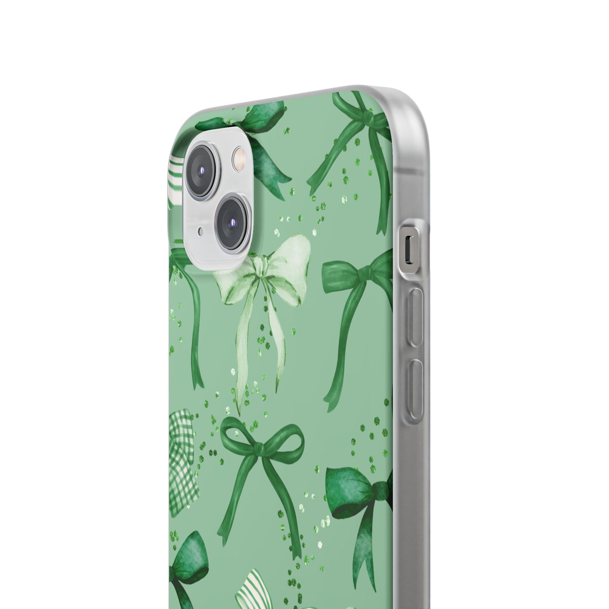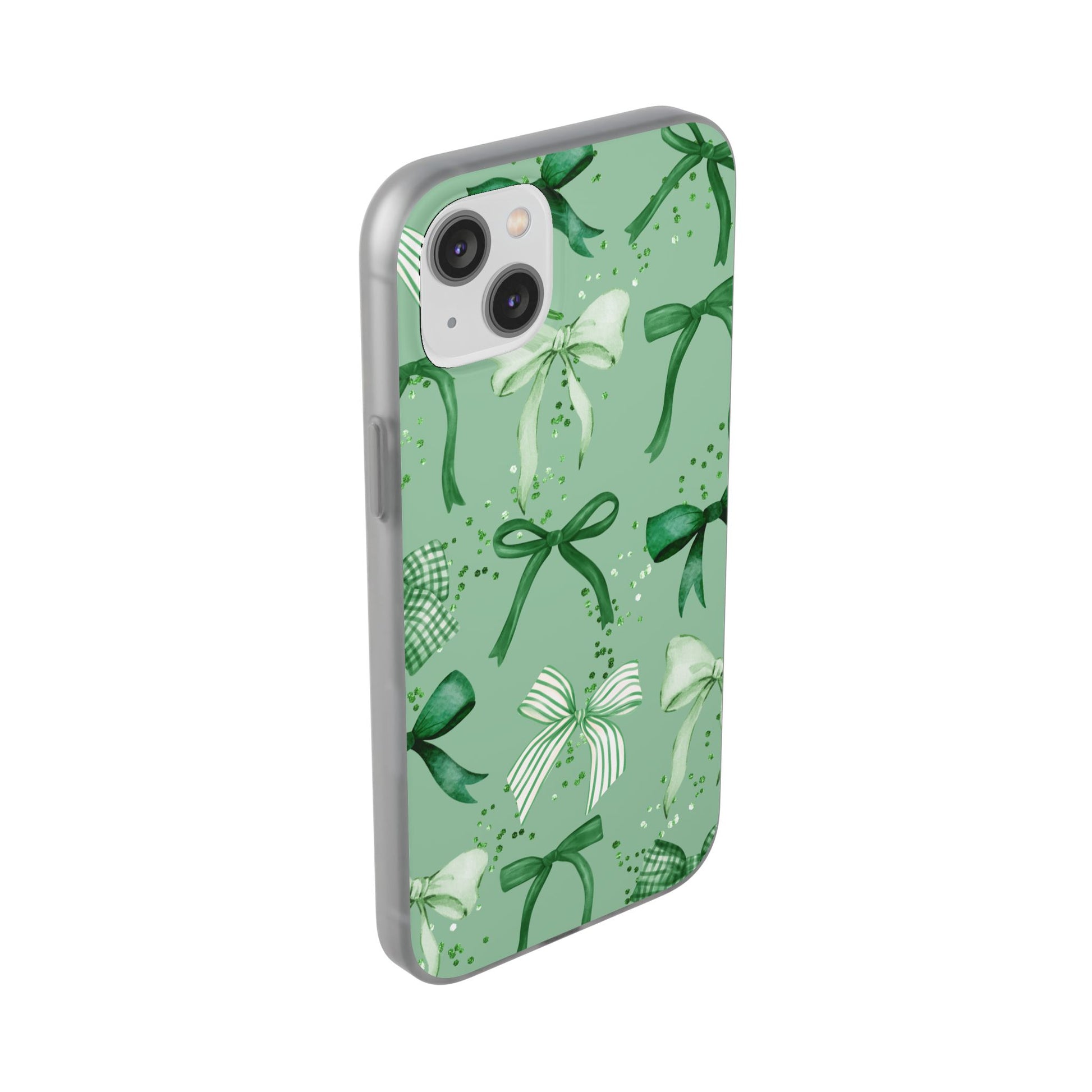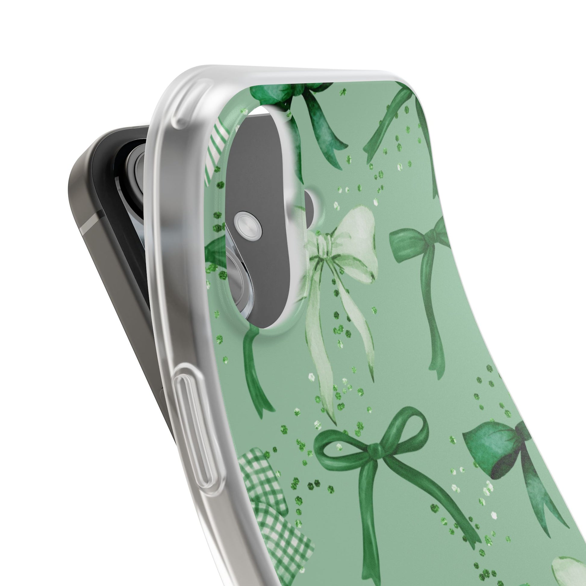 A minty green background with emerald green bows flexi case, offering a smooth frosted finish and flexibility with impact-absorbing design. Perfect for adding a pop of color and protection to your phone. Ideal for adults looking for a stylish and durable phone case, relevant to birthdays, holidays, and everyday use.
